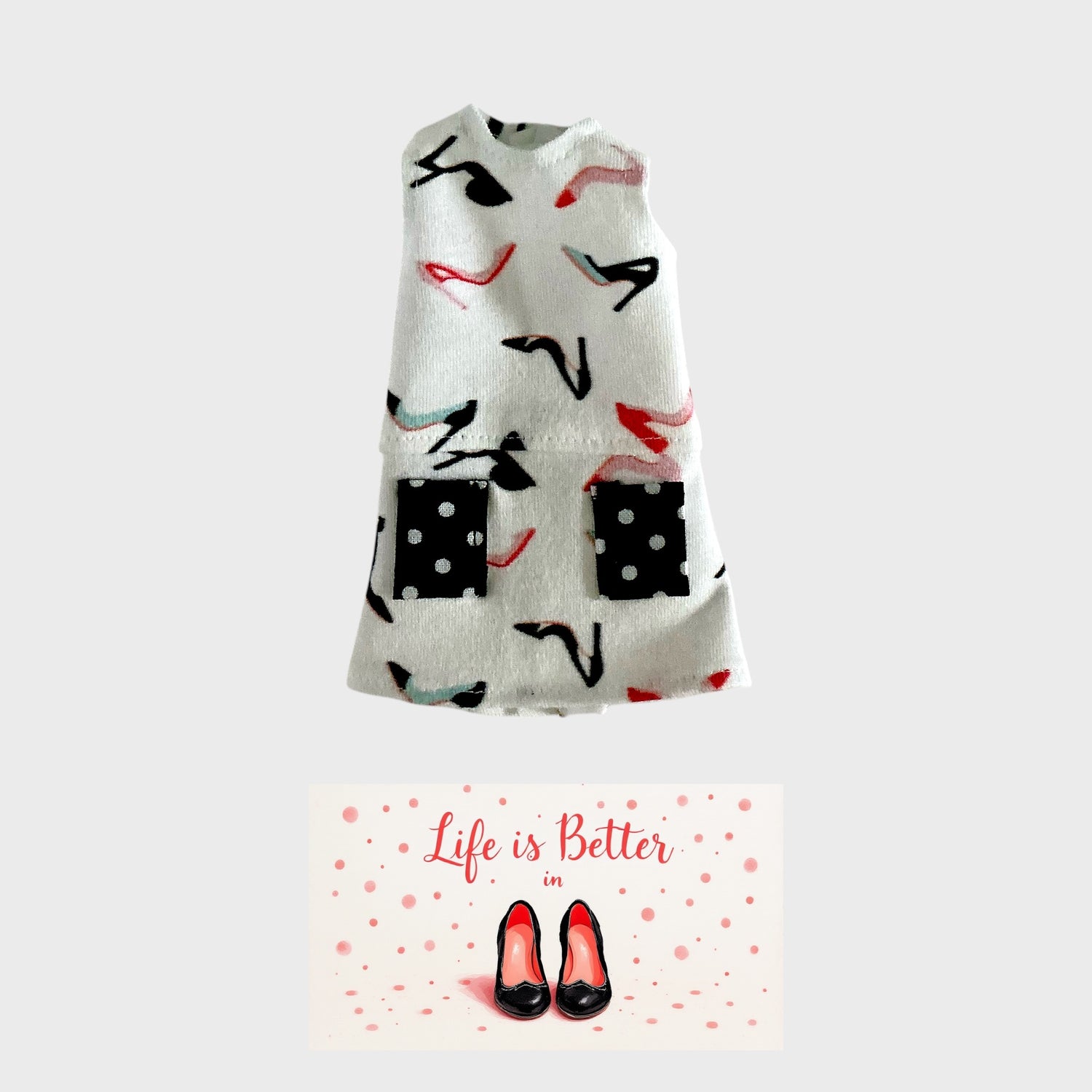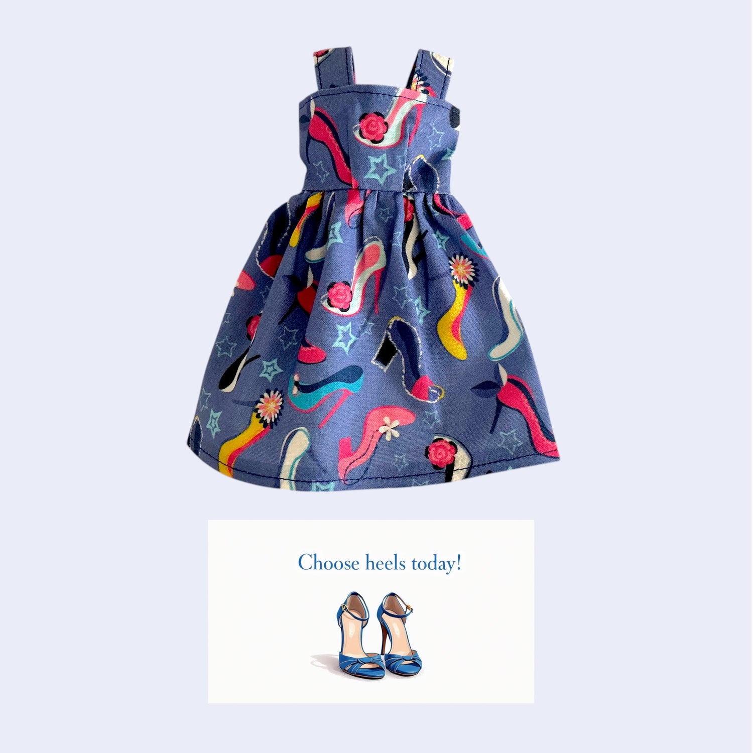 The pattern used to make this dress is from JoyFilled Dolls! The fabric is cotton. It has pink, white, yellow, and teal heels on a periwinkle blue background. The fabric is from Spoonflower.